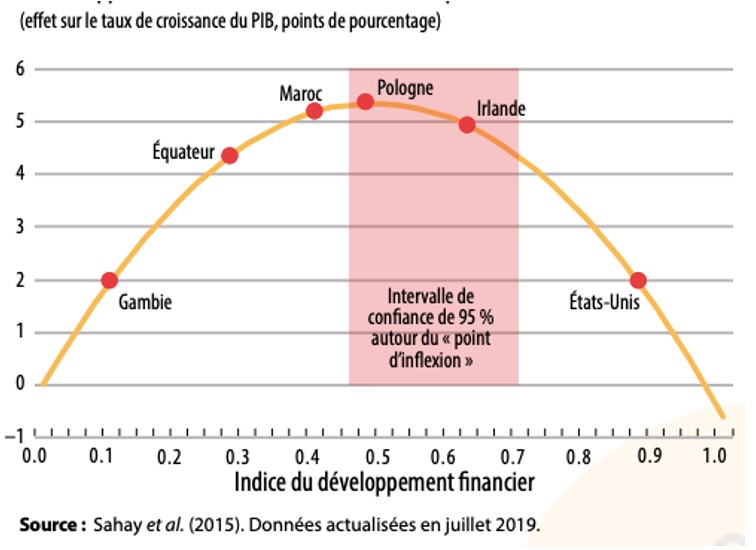 - la troisième étape indique que le développement des institutions financières et les marchés financiers n’apportent plus de gains de croissance. Au contraire, il existe une relation négative entre développement des marchés financiers et taux de croissance du PIB. En d'autres termes, de nombreuses fonctions du secteur financier, telles que la mobilisation de l'épargne et la facilitation des transactions, peuvent rester intactes à des niveaux élevés de développement financier, mais d'autres fonctions, telles que l'efficacité de l'allocation des capitaux et l'efficacité du contrôle des entreprises commence à être moins efficace.