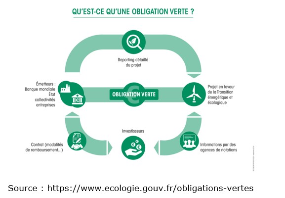 Selon le Ministère de la transition écologique, une obligation verte est un emprunt émis sur le marché par une entreprise ou une entité publique auprès d’investisseurs pour lui permettre de financer ses projets contribuant à la transition écologique (énergies renouvelables, efficacité énergétique, gestion durable des déchets et de l’eau, exploitation durable des terres, transport propre et adaptation aux changements climatiques...), plus particulièrement les investissements en infrastructures.