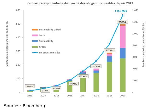 Selon Bloomberg, les émissions d’obligations vertes, sociales et durables sont de 496 milliards de dollars en 2020, dont 250 milliards pour les obligations vertes, soit 1314 milliards de dollars d’émission cumulées.