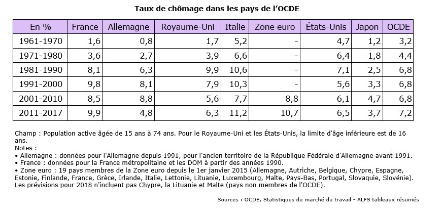 Le taux de chômage a augmenté dans l’ensemble des pays de l’OCDE à partir de la fin des années 1960. Toutefois, cette hausse a été plus ou moins importante selon les pays. Le Japon et les Etats-Unis ont réussi à contenir le développement du chômage et à le maintenir à des taux inférieurs à 7%. Quant à l’Allemagne et à l’Angleterre, ils ont réussi à atteindre des niveaux de chômage plus faibles depuis les années 2000, après une hausse relativement importante jusqu’à la fin du XXème siècle. L’Italie a quant à elle connu une hausse du chômage continue et plus importante qu’ailleurs, pour atteindre un pic à 11% au cours de la dernière décennie.