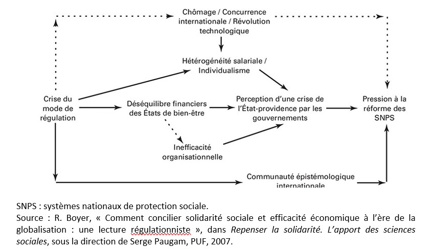 Suite à la crise des années 1970, un nouveau « mode de régulation » l’a remplacé. Le rapport salarial a changé en raison de la concurrence internationale accrue, du chômage et du changement technologique, devenant moins favorables à des augmentations de salaires et produisant plus d’inégalités entre les salariés. Ces évolutions ont provoqué un individualisme croissant. De son côté, l’Etat en crise de financement et d’efficacité organisationnelle. Tous ces éléments ont conduit à la perception d’une « crise » de l’Etat-Providence par les gouvernants.