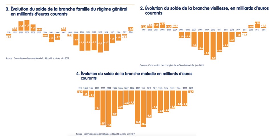 Le déficit de la sécurité social a connu un pic autour de l’année 2010, pour atteindre 3,2 milliards d’euros au sein de la branche famille en 2013, 8,9 milliards au sein de la branche vieillesse en 2010 et 11,6 milliards en 2010 au sein de la branche maladie.