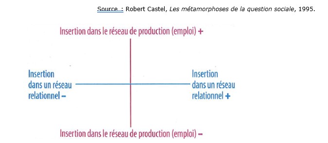 (...) La rupture des liens sociaux est un processus qui peut s’analyser à travers deux axes. D’abord, une distance plus ou moins grande par rapport au réseau de la production de richesses, c’est-à-dire l’emploi où la forme serait un emploi stable à temps plein. Ensuite, une distance plus ou moins grande avec un réseau relationnel composé de la famille, des amis etc. »