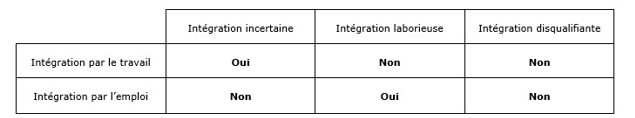 J'ai par la suite élargi le concept de disqualification sociale au monde du travail en examinant et comparant les formes de l'intégration professionnelle. À partir d'une enquête auprès d'un échantillon diversifié de salariés, laquelle a abouti à la publication du Salarié de la précarité, j'ai pu constater que le processus de disqualification sociale ne commence pas obligatoirement par l'expérience du chômage, mais que l'on peut trouver dans le monde du travail des situations de précarité comparables à l'expérience du chômage, au sens de la crise identitaire et de l'affaiblissement des liens sociaux. Rappelons ici, brièvement, que la précarité des salariés a été analysée en partant de l'hypothèse que le rapport au travail et le rapport à l'emploi constituent deux dimensions distinctes de l'intégration professionnelle, aussi fondamentales l'une que l'autre. C'est ainsi que le type idéal de l'intégration professionnelle a été défini comme la double assurance de la reconnaissance matérielle et symbolique du travail et de la protection sociale qui découle de l'emploi. La première condition est remplie lorsque les salariés disent qu'ils éprouvent des satisfactions au travail, et la seconde, lorsque l'emploi qu'ils exercent est suffisamment stable pour leur permettre de planifier leur avenir et d'être protégés face aux aléas de la vie. Ce type idéal, qualifié d'intégration assurée, a permis de distinguer, par déduction, et de vérifier ensuite empiriquement, trois types de déviations : l'intégration incertaine (satisfaction au travail et instabilité de l'emploi), l'intégration laborieuse (insatisfaction au travail et stabilité de l'emploi) et l'intégration disqualifiante (insatisfaction au travail et instabilité de l'emploi). L'intégration disqualifiante affecte alors les deux sources du lien social : la protection du fait de l'instabilité de l'emploi, la reconnaissance du fait de l'insatisfaction au travail.