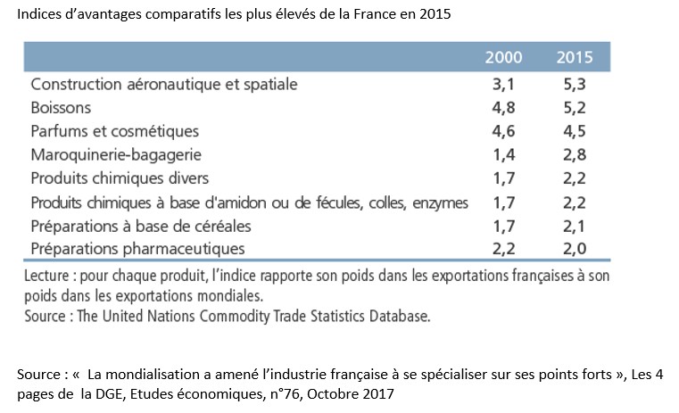 Globalement, depuis 2000 on assiste à un renforcement de la spécialisation de la France dans l’aéronautique, les boissons, la maroquinerie, la chimie ainsi que dans les préparations à base de céréales. Les autres domaines (cosmétiques et parfums, préparations pharmaceutiques, ont légèrement régressé.