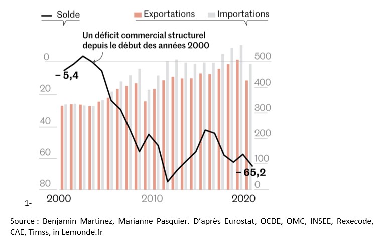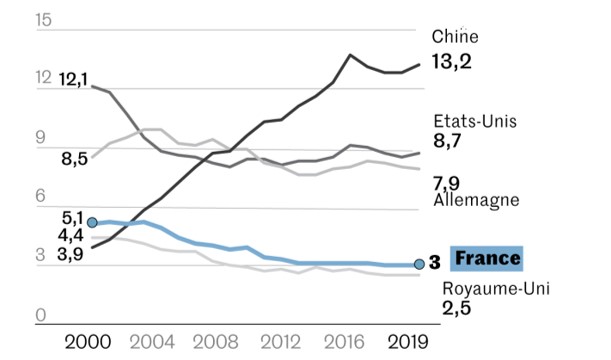Depuis 2000, la part des exportations de marchandises de la France dans les exportations mondiales a été presque divisée par 2, passant de 5% à 3%. La France connaît un déficit de son solde extérieur de produits industriels depuis le début des années 2000.