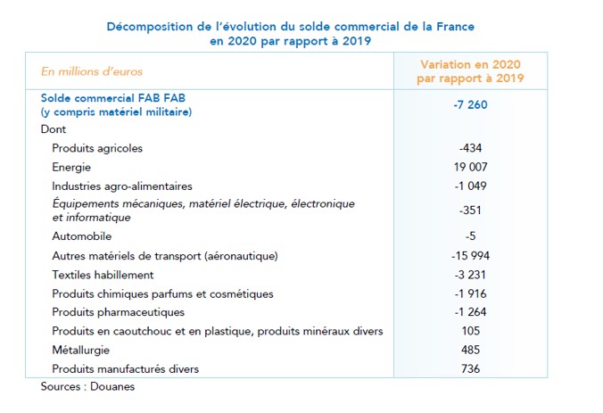 On note une hausse du déficit de la balance commerciale entre 2019 et 2020 (-7260 millions d’euro) ainsi que de celui des services (-13 473 millions d’euro). En examinant la décomposition de l’évolution la balance commerciale des biens et celle des services, on note une amélioration considérable du solde de la balance énergétique (+19,0 milliards d’euros en 2020 par rapport à 2019) qui fait plus que compenser la dégradation du solde des échanges des produits de l’aéronautique (-16,0 milliards d’euros en 2020 par rapport à 2019). Au total, le déficit de la balance commerciale s’est creusé de plus de 7 milliards d’euros en 2020. Les textiles et l’habillement y contribuent à hauteur de près de la moitié, les produits chimiques, parfums et cosmétiques pour plus du quart et les produits pharmaceutiques pour un sixième. Concernant la décomposition du creusement du déficit de la balance des services, le tourisme (« Voyages ») rend compte de plus de la moitié (52 %) de la diminution de 13,5 milliards d’euros ce déficit de la balance des services en 2020 par rapport à 2019 et les « Autres services aux entreprises » (R&D, conseil, services techniques…) y contribuent pour plus d’un cinquième.