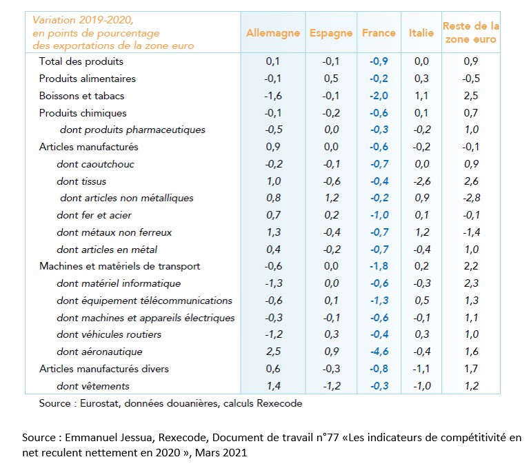 Quand on réalise une analyse sectorielle des parts de marché françaises à l’exportation de biens relativement à ses partenaires commerciaux, on constate en outre que ses parts de marché à l’exportation ont davantage reculé en 2020 dans ses domaines de spécialisation (aéronautique) que chez ses principaux concurrents européens, puis que ces pertes françaises de parts de marché, loin de se cantonner à ces secteurs, concernent la quasi-totalité des produits d’exportation.