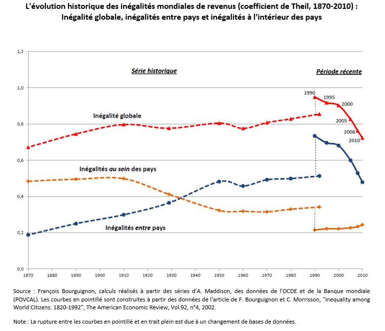 Sur le graphique, la courbe rouge de l'inégalité mondiale représente l'évolution des inégalités dans la distribution mondiale des niveaux de vie. La dispersion des revenus est calculée à l'aide d'un indice synthétique, le coefficient de Theil. Comme l'indice de Gini, plus l'indicateur de Theil est élevé, plus les inégalités sont fortes. Entre 1990 et 2010, le Theil global est passé de 0,95 à 0,72 soit une diminution de 24%. Ainsi, le niveau d'inégalité mondiale, entre tous les habitants de la planète, a retrouvé un niveau comparable à celui de la fin du XIXe siècle.