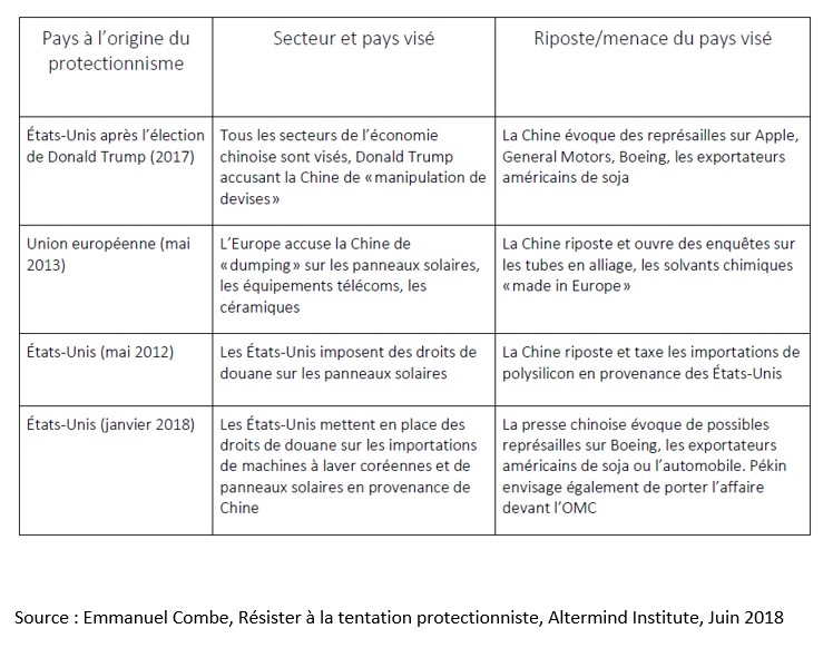 Si l’on n’observe pas pour l’heure de « raz de marée » dans l’opinion publique en faveur d’un retour au protectionnisme — contrairement à une idée répandue — il n’en demeure pas moins que le discours protectionniste trouve aujourd’hui un écho favorable auprès d’une partie de la population : l’arrivée au pouvoir en janvier 2017 de Donald Trump, qui a bâti l’essentiel de sa campagne électorale sur cette thématique, en constitue l’exemple le plus frappant. Plus encore, au-delà des discours et postures politiques, plusieurs pays, au premier rang desquels les États-Unis et l’Union européenne, ont renforcé leur politique commerciale ou mis en place de nouvelles barrières aux échanges : Songeons par exemple à l’imposition en mars 2018 de droits de douane de 20 à 50 % par les États-Unis sur les machines à laver coréennes, de 15 à 30 % sur les panneaux solaires chinois, de 25% sur les importations d’acier et de 10% sur celles d’aluminium. Bref, les ingrédients sont réunis pour que demain les grands pays développés cèdent à la tentation du retour au protectionnisme, ce qui ne manquerait pas d’enclencher une guerre commerciale, notamment avec nos partenaires asiatiques. […]