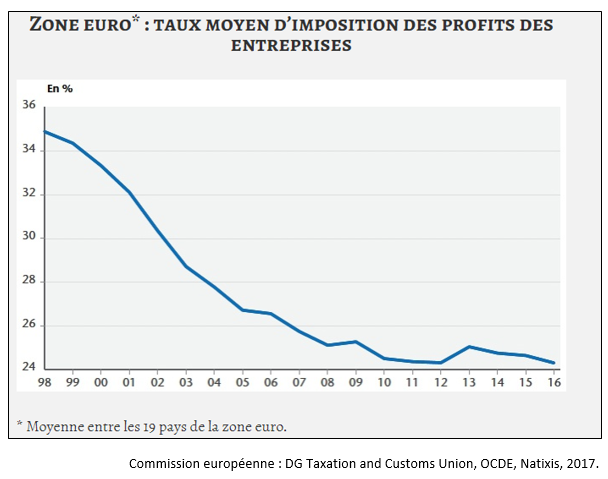 D’après une étude de Natixis, en 2016, sur 100 euros de profits réalisés par les entreprises au sein de la zone euro, 24 en moyenne sont prélevés au titre de l’impôt sur les sociétés.
