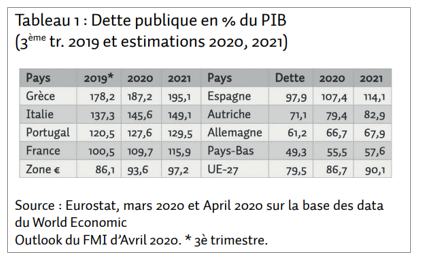 Après avoir émis l’hypothèse de recourir aux eurobonds au sein de la zone euro en raison des effets de la crise des années 2007-2008, voici qu’apparaît l’idée des coronabonds (ou recovery bonds) du fait de la pandémie qui touche l’Union européenne (UE) depuis plusieurs semaines. […] Les eurobonds permettent aux pays européens de la zone euro de financer leur déficit. Ces titres sont libellés en euros. Au lieu d’une garantie nationale qui caractérise une obligation nationale, les eurobonds bénéficient de la garantie européenne. Il s'agit d'emprunts émis en commun par les pays de la zone euro sur les marchés internationaux. Ce dispositif est particulièrement utile pour les pays très endettés (tableau 1) dont on sait qu’ils vont l’être encore davantage d’ici l’année prochaine.