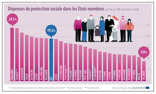 Selon Eurostat, sur 100 euros de richesses créées dans l’UE en 2018, 19,2 sont consacrés à la protection sociale.