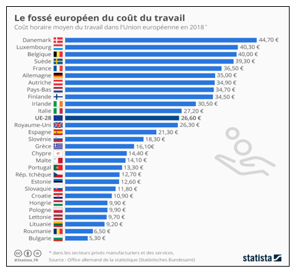 Selon l’office allemand de la statistique, en France, le coût horaire moyen dans le secteur privé en 2018 est de 36,5 euros soit environ 10 euros de plus que la moyenne de l’UE.