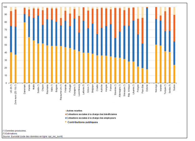 • Les pays pour lesquels la protection sociale est principalement financée par les contributions publiques (impôts) : Danemark, Irlande, Malte, Suède, Chypre, Roumanie, Royaume-Uni et Portugal.