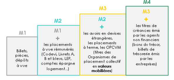 L’évaluation de la masse monétaire prend la forme d’agrégats monétaires et on définit, par élargissements successifs, une série de quatre agrégats emboîtés : M1, M2, M3, M4. Cette distinction traduit des degrés de liquidité et le caractère plus ou moins risqué de la conversion de la créance en liquide. L’agrégat M1 est l’ensemble des disponibilités monétaires. L’agrégat M2 est l’ensemble des disponibilités monétaires et « quasi monétaires » (placements à vue rémunérés). L’agrégat M3 contient, outre M2, les dépôts à terme ainsi que les bons (non négociables) et les titres émis par les institutions financières. Il est l’agrégat officiel de masse monétaire pour la politique monétaire.