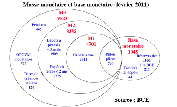 3) Il est important de ne pas confondre la base monétaire qui correspond aux pièces (monnaie divisionnaire) et billets en circulation (les liquidités au sens strict) avec la masse monétaire qui correspond à de l'épargne non encore convertis en liquidités. La masse monétaire est l’ensemble des actifs liquides, c’est-à-dire susceptibles d’être utilisées dans les règlements de dettes, détenus à un moment donné par les agents économiques. Elle est un stock, mesuré, à une date déterminée, par le biais d’agrégats monétaires qui servent aussi à la définition des objectifs de la politique monétaire. Ce stock est un actif pour les agents économiques et une dette ou un passif pour les institutions monétaires.