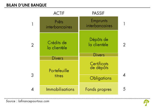 13) une banque a un bilan à la fois comparable et différent de celui d’un entreprise non bancaire. Elle dispose de fonds propres à son passif et de dettes : sauf que les dette sont les avoirs de ses clients (particuliers et entreprises). Elle dispose d’actifs immobilisés mais ses actifs sont essentiellement les prêts accordés aux agents économiques.