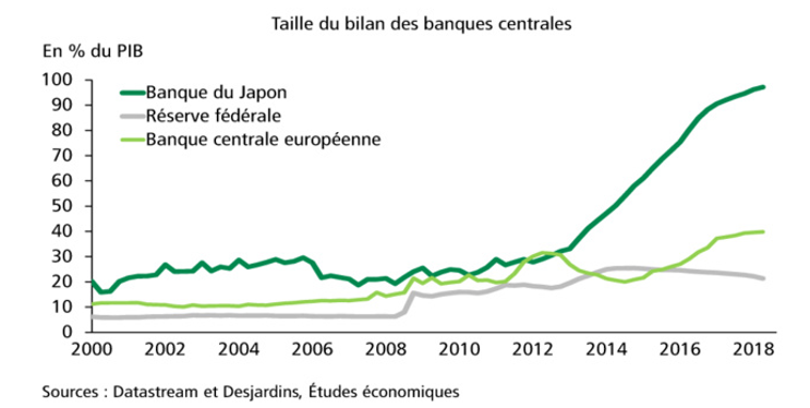 17) les banques centrales monétisent de plus en plus, au lendemain de la crise, les dettes de l’Etat. Le schéma fait apparaître clairement l’explosion de ses actifs par rapport au PIB après 2008. Le cas du Japon est particulier car les détenteurs de la dette publique dans ce pays sont les résidents. En 2018, la dette publique est de 250 % du PIB au Japon mais 95 % de la dette est détenus par les japonais eux-mêmes sous forme d’obligations d’Etat ou par le biais des placements dans les banques commerciales nationales.