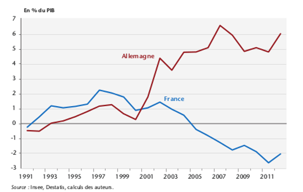 Document 13 : Solde du commerce extérieur (balance commerciale) rapporté au PIB pour la France et l’Allemagne
