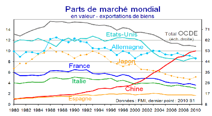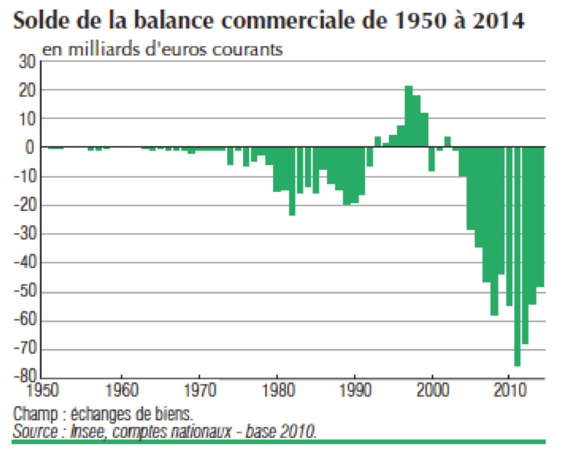 18 ) de nombreuses études comparent la France et l’Allemagne, sans doute car il s’agit de notre premier partenaire commercial. La France a eu très souvent une balance commerciale déficitaire durant les Trente Glorieuses, alors que c’était le cas inverse pour l’Allemagne. La seule période où la France eu des excédents significatifs depuis la guerre est la période 1990-2000, en raison de la baisse des cours du pétrole, des excédents dans certains secteurs économiques comme l’aéronautique et l’agroalimentaire et la rigueur salariale liée à la montée du taux de chômage. La crise financière a mis l’accent sur les failles de l’appareil productif de la France. Si l’industrie ne fait plus que 10 % des emplois en France, elle fait encore plus de 20 % en Allemagne. L’Allemagne a su se spécialiser dans des activités à plus forte valeur ajoutée, mécanique de précision, robotique, chimie. La France est connue à l’étranger essentiellement pour les biens de luxe. La France est spécialisée trop souvent dans des produits moyenne gamme qui la privent de compétitivité prix et qualité (hors prix). Le phénomène n’est pas récent car C. Stoffaes, dans La grande menace industrielle en 1976, notait déjà les doublons qui privaient la France d’efficacité. Il montrait la trop grande importance des conglomérats financiers comme le groupe PUK à la différence des groupes allemands mieux spécialisés.