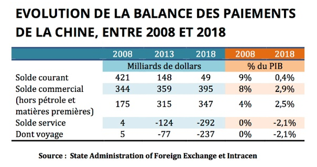 21 ) Ce dernier document met en avant les mutations d’un aspect de l’état de la balance des paiements de la Chine sur les dix dernières années. Il s’agit essentiellement de la balance des transactions courantes (balance commerciale et des services). La Chine continue d’accroître ses excédents dans le domaine des produits manufacturés. L’OMC montre d’ailleurs que la Chine exporte plus en quantité mais aussi en valeur ajoutée. Si la part de ses exportations baisse dans le PIB, c’est en raison de l’accroissement de la demande nationale. Le centre des études économiques de l’université de Fudan (E.U.C) donne les chiffres suivants : les exportations de biens manufacturés représentaient 38 % du PIB chinois en 1998, 27 % en 2008 et seulement 16 % en 2018. En revanche, la consommation finale des ménages en Chine a été multipliée par 3 en 20 ans (en volume).