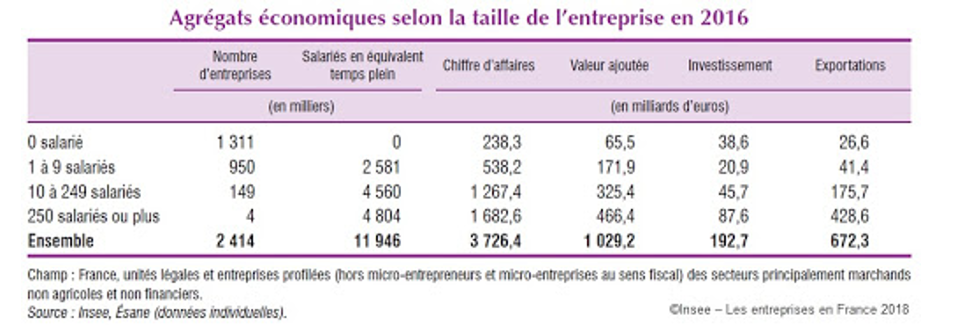 Selon l’INSEE, en 2017, la France comptait 3.8 millions de PME marchandes non agricoles et non financières, y compris les micro-entreprises. Parmi celles-ci, 3.7 millions sont des MIC, qui emploient 2.4 millions de salariés en équivalent temps plein (ETP) et réalisent 20 % de la valeur ajoutée. 148 000 PME (hors MIC) emploient 3.9 millions de salariés et réalisent 23 % de la valeur ajoutée. Au total, les PME emploient ainsi 6.3 millions de salariés (ETP) et réalisent 43 % de la valeur ajoutée.