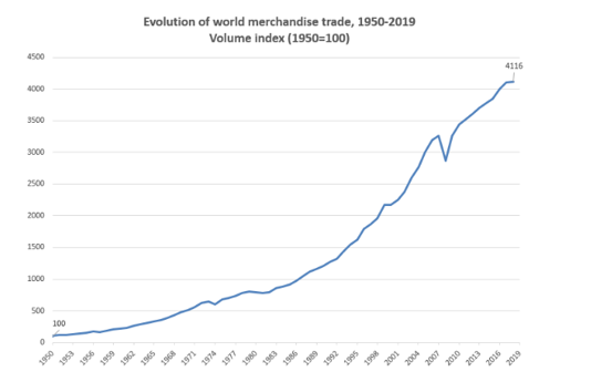 A partir de 1950, l’accroissement du volume des exportations mondiales est supérieur à celui de la production de marchandises (respectivement une multiplication par 32.4 et 8.4 entre 1950 et 2007). La part des biens et de services dans le PIB mondial (données des comptes nationaux de la Banque Mondiale pour l’OCDE) était de 13.6 en 1970 et de 30.5 en 2019. Le taux d’ouverture de l’économie française (moyenne des exportations et des importations/PIB) est passé de 13 % à 31.5 % de 1965 à 2017.