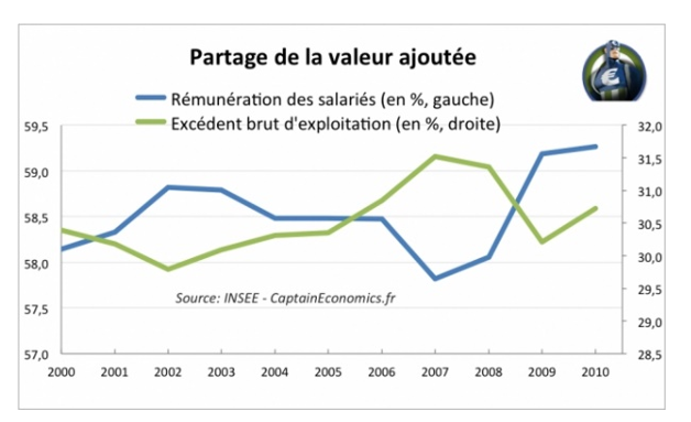 11 ) la valeur ajoutée est répartie de la manière suivante : une part correspond à la rémunération du facteur travail (versement des salaires et charges sociales), l’autre rémunère le capital. Pour simplifier, nous ne tenons pas compte ici des impôts liés à la production notés dans le compte exploitation. La part des salaires a été relativement stable (66 % de la valeur ajoutée) durant la période appelée des Trente Glorieuses. Entre le début des années 1970 jusqu’au second choc pétrolier, la part des salaires a augmenté au détriment donc de l’EBE. C’est la décennie 1980 qui provoquera un changement de situation : la part des salaires fléchit de façon sensible entre 1980 et 1990 puis restera stable ensuite. Le taux de marge des entreprises, qui avait baissé entre 1970 et 1980, remonte entre 1980 et 1990 puis restera à un niveau élevé durant les années 1990 et une bonne partie du début du XXI siècle. L’éditorialiste E. Lechypre, dans le journal L’Expansion proposa, en 2007, en couverture, l’image d’une racine carrée √ : celle-ci représentait l’évolution du taux du taux de marge des entreprises depuis les années 1970. La contestation de l’OST et l’épuisement du modèle fordiste explique en partie la hausse des salaires sur la période 1970-1980. La hausse du prix du pétrole et l’inflation à deux chiffres a provoqué la spirale inflationniste : la hausse des prix provoque la hausse des salaires qui, à son tour, entraînant une hausse des coûts, donne une nouvelle augmentation des prix. La baisse de la part des salaires dans le PIB dans les années 1980 est liée à la montée du chômage : le taux de chômage en France était de 3 % en 1974, il est de 6 % en 1981, sera de 8 % en 1984 et de 12 % en 1995.