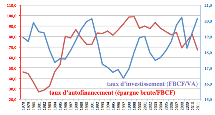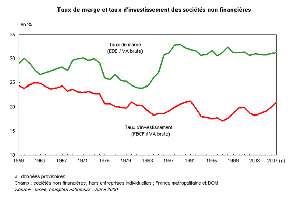 15 ) une corrélation existe bien entre le taux de marge, le taux d’épargne des entreprises, le taux d’autofinancement et le taux d’investissement. Quand l’EBE chute, il provoque inévitablement une chute du RDB ou épargne brute (EB). Les entreprises, dans l’obligation de maintenir un niveau d’investissement, empruntent davantage et remettent en cause leur capacité d’autofinancement. A l’inverse la hausse de l’EBE provoque le contraire. Toutefois, les baisses et les hausses ne se font pas forcément au même rythme selon certaines variable économiques comme le taux d’intérêt.