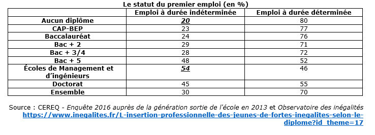 Selon le CEREQ, dans la génération sortie de l’école en 2013, les titulaires d’un diplôme d’une école de Management ou d’ingénieurs étaient 54% à obtenir un emploi à durée indéterminée, contre seulement 20% pour ceux n’ayant aucun diplôme.
