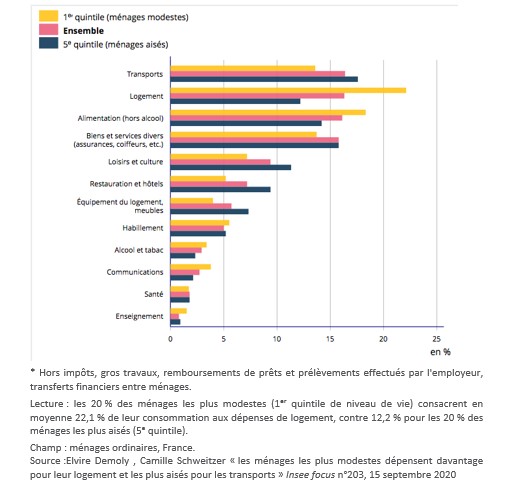 Le document 1 confirme effectivement la loi d’Engel puisqu’il permet de comparer à un moment donné (ici en 2017) la structure de la consommation selon le niveau de vie. On constate donc que, conformément à la loi d’Engel, la part des dépenses consacrées à l’alimentation (hors alcool) représente environ 18% du budget des 20% des ménages les plus modestes alors que cette part représente environ 14% du budget des 20% des ménages les plus aisés en 2017 selon l’Insee.