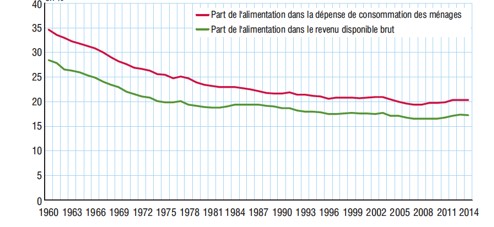 Document 5 : Part de la dépense de consommation alimentaire dans le revenu disponible brut et la dépense de consommation des ménages de 1960 à 2014