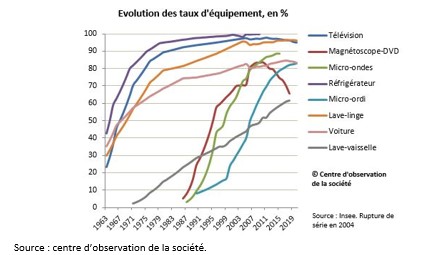 Dans les années 1960 et 1970, la France entre dans la société de consommation, les biens durables deviennent accessibles, à la fois grâce à la production en série qui permet de baisser les prix et grâce à la hausse des salaires. De plus en plus de ménages s’équipent en réfrigérateur (dès la fin des années 70, 95% des ménages sont équipés en réfrigérateur), lave linge ou téléviseur. La démocratisation de la voiture est en revanche plus lente, étant donné le prix plus élevé. Le lave-vaisselle demeure un équipement plus superflu, en effet même si le taux d’équipement progresse à un rythme régulier depuis le début des années 70, près de 40% des ménages ne sont pas équipés en lave vaisselle en 2019.