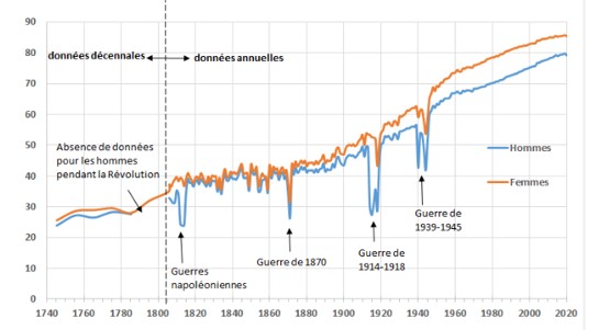 Lecture du graphique : Ce graphique présente l’évolution de l’espérance de vie à la naissance en France, de 1740 à 2020. L’axe horizontal couvre les 280 dernières années, depuis le milieu du XVIIIe siècle. L’espérance de vie calculée pour une année représente la durée de vie moyenne d’un groupe de personnes qui seraient soumises, âge après âge, aux conditions de mortalité de l’année : entre la naissance et le premier anniversaire, elles connaîtraient le risque de décéder des individus de moins d’un an cette année-là, entre 1 et 2 ans, le risque de décéder des enfants de cet âge la même année, etc.