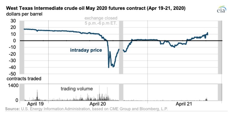En règle générale, la plupart des participants au marché clôturent tous les contrats à terme avant leur expiration au moyen d'un règlement en espèces (achats ou ventes de contrats de compensations) pour éviter d’en prendre la livraison physique. Au quotidien, seul 1% des contrats à terme négociés sont livrés physiquement. Mais, en avril 2020, devant l'incapacité à trouver d'autres participants auxquels vendre leurs contrats à terme, les traders auraient dû prendre livraison du pétrole… alors que les installations de stockage de pétrole brut de Cushing était pleines (ou déjà louées) compte tenu de la chute de la demande mondiale de pétrole avec la pandémie (cf. restrictions des voyages, ralentissement économique).