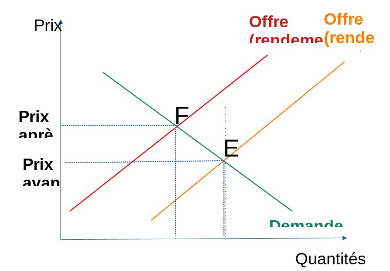 L’objectif de la taxe est de rapprocher du point F, qui est l’équilibre en fonction du rendement social, c’est-à-dire une fois l’externalité internalisée. La taxe doit faire que pour chaque prix, l’offre passe de la courbe orange à la courbe rouge (produire coûte plus cher, la production diminue pour chaque prix) Si elle est bien calibrée, elle conduit à ce que l’équilibre soit le point F.