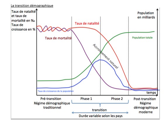 La transition démographique se déroule en deux temps, lors de la première phase, le taux de mortalité chute fortement (de nombreux facteurs expliquent cette baisse du taux de mortalité : ce sont les progrès en termes de productivité dans l’agriculture qui permettent d’améliorer l'alimentation, ce sont les progrès en matière d'hygiène, de médecine…) alors que le taux de natalité reste élevé voire augmente. L'accroissement naturel est donc important, ce qui entraine une croissance rapide de la population.