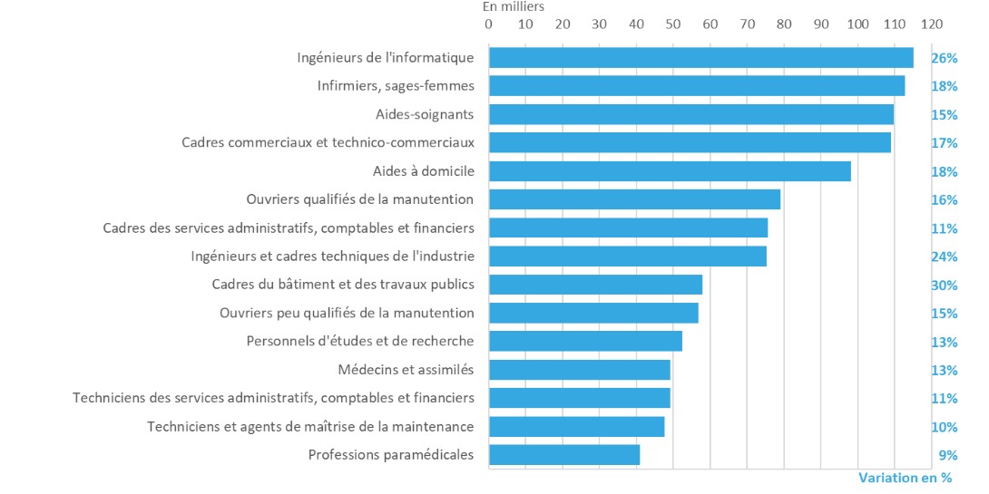 Les 15 métiers avec le plus de postes à pourvoir peuvent être classés en 3 catégories. Il y a d’abord ceux qui créent peu d’emplois, et dont les postes à pourvoir correspondent avant tout aux remplacements des départs en fin de carrière (agents d’entretien ; enseignants ; conducteurs de véhicules ; vendeurs et ouvriers du second œuvre du bâtiment). Il y a ensuite ceux dont la dynamique des effectifs contribue à hauteur d’environ un quart des postes à pourvoir (cadres administratifs, comptables et financiers ; cadres commerciaux et technico-commerciaux ; aides à domicile ; aides-soignants ; infirmières et sages-femmes ; ouvriers qualifiés de la manutention ; médecins ; techniciens de la maintenance). Il y a enfin les ingénieurs de l’informatique et les ingénieurs et cadres techniques de l’industrie où les créations d’emplois représentent au moins la moitié des postes à pourvoir.