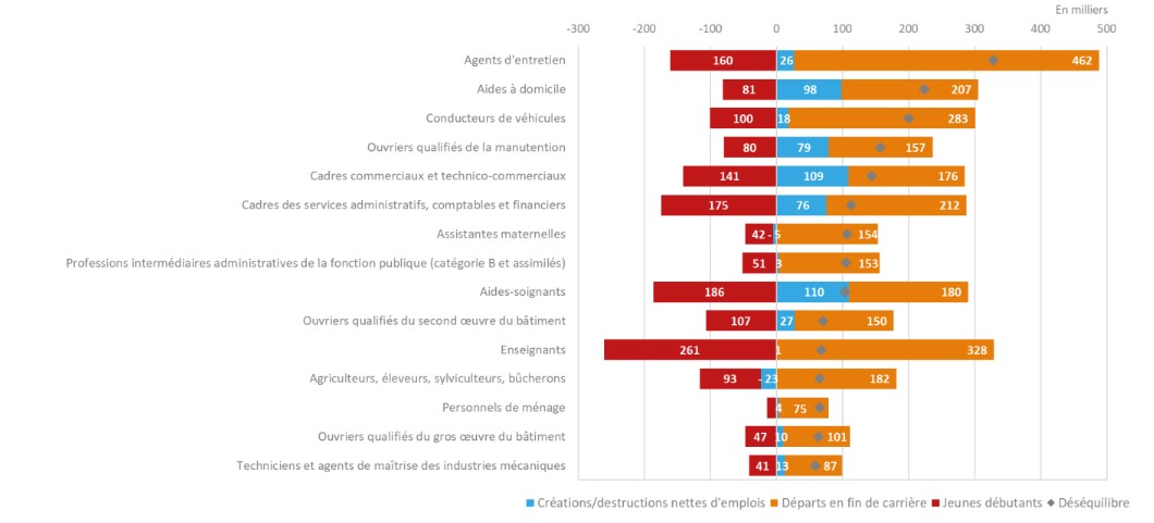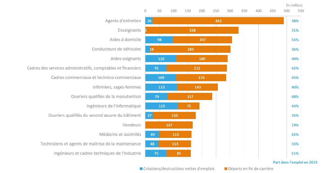 Pour chaque métier, on peut obtenir les postes à pourvoir en additionnant les créations nettes d’emploi ci-dessus et les départs en fin de carrière (retraites). Dans l’ensemble, de 2019 à 2030, les postes à pourvoir s’établiraient à 760000 chaque année, les départs en fin de carrière représentant 90% du total.