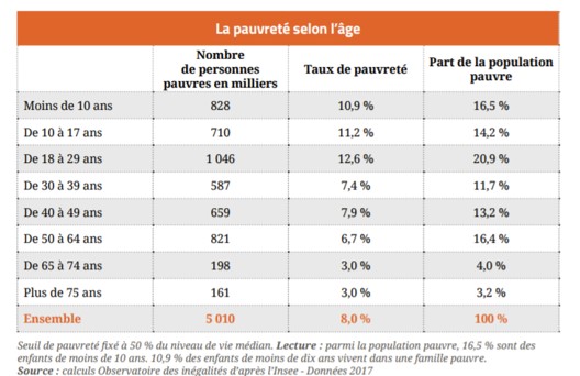 Exploitation du document 1 : en France en 2017, sur 100 jeunes âgés de 18 à 29 ans, 12,6 en moyenne sont sous le seuil de pauvreté (à 50 % du revenu médian). Le taux de pauvreté diminue ensuite avec l’âge. Sur 100 personnes âgées de plus de 75 ans, 3 en moyenne sont touchées par la pauvreté.