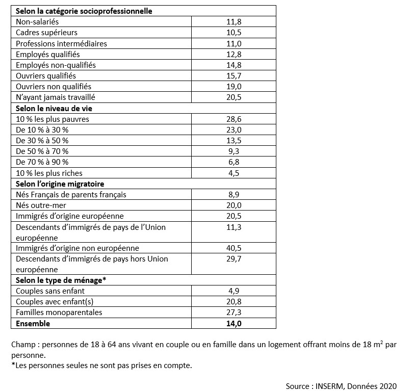 En France en 2020, sur 100 personnes vivant en couple ou en famille appartenant aux 10 % les plus pauvres, 28,6 en moyenne se trouvent dans un logement suroccupé. Sur 100 personnes vivant en couple ou en famille appartenant aux 10 % les plus riches, 4,5 en moyenne habitent un logement suroccupé.