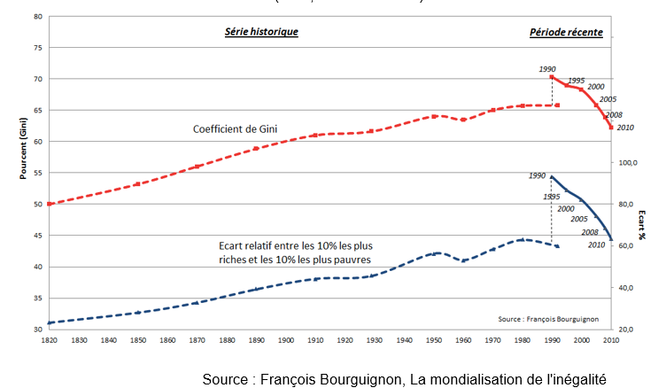 - Selon les calculs de François Bourguignon, entre 1820 et 1990, le coefficient de Gini pour l’inégalité globale est passé de 50% à 65%, soit une hausse de 15 points. Entre 1990 et 2010, le coefficient est passé de 70% à 62%, soit une diminution de l’inégalité globale de 8 points.