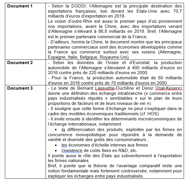 Bernard Lassudrie-Duchêne et Deniz Ünal-Kesenci (document 3) soulignent que la théorie de l’avantage comparatif reste une notion fondamentale. Toutefois, elle ne peut expliquer les échanges entre pays industrialisés, comme la France et l’Allemagne. En effet, les échanges entre ces deux partenaires européens sont des échanges intra-branches, soit un « commerce entre pays industrialisés réputés « semblables » sur le plan de leurs proportions de facteurs et de leurs niveaux de vie » (Bernard Lassudrie-Duchêne et Deniz Ünal-Kesenci) (document 3) à l’image des exportations et importations croisées de voitures. Ainsi, le commerce intra-branche est un commerce croisé de biens similaires. Un pays comme la France importe et exporte des produits issus des mêmes branches de l’industrie (automobiles) ou des services (services financiers).