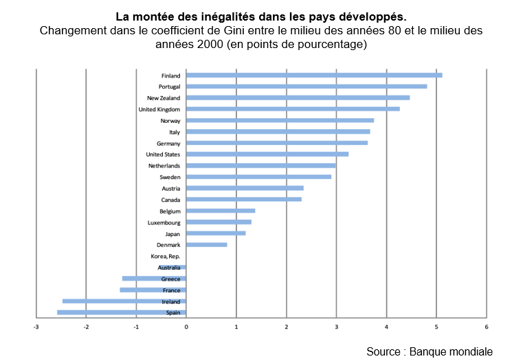 - Le développement du commerce international, s’il a réduit l’inégalité globale, a aussi entraîné une hausse des inégalités au sein des pays. Le document permet de comprendre cette hausse au sein de l’Union européenne (Finlande, Portugal), du Royaume-Uni et des États-Unis. Par exemple, le coefficient de Gini entre le milieu des années 80 et le milieu des années 2000, a augmenté de plus de 5 points en Finlande.