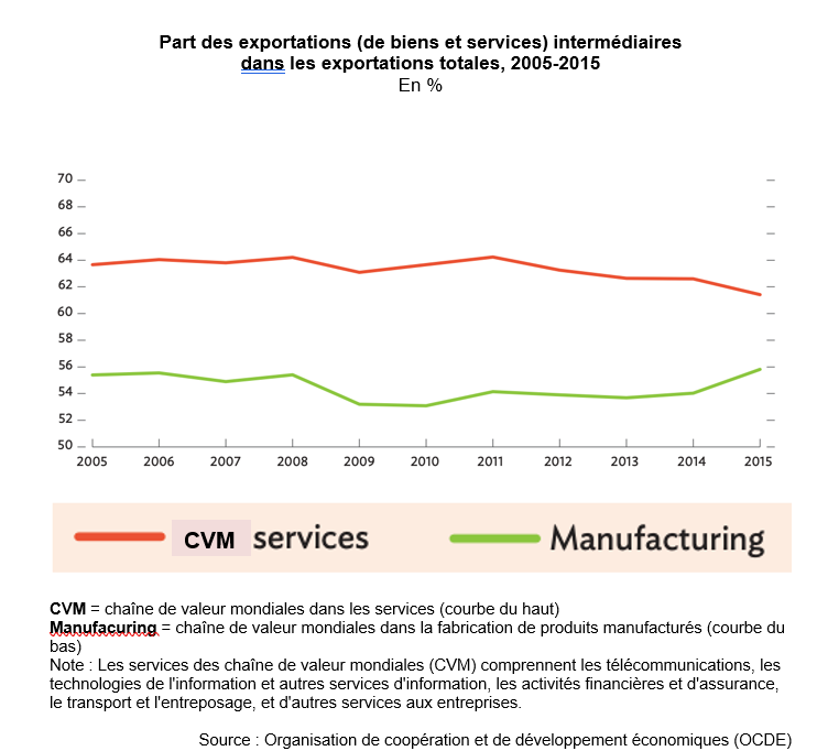 Selon l’OCDE, la part des exportations de produits intermédiaires dans les exportations totales engagés dans les chaînes de valeur mondiales (CVM) de services est d'environ 62% en 2015, contre 56% pour les exportations de produits intermédiaires dans les exportations totales de produits manufacturés, soit une différence de 7 points.