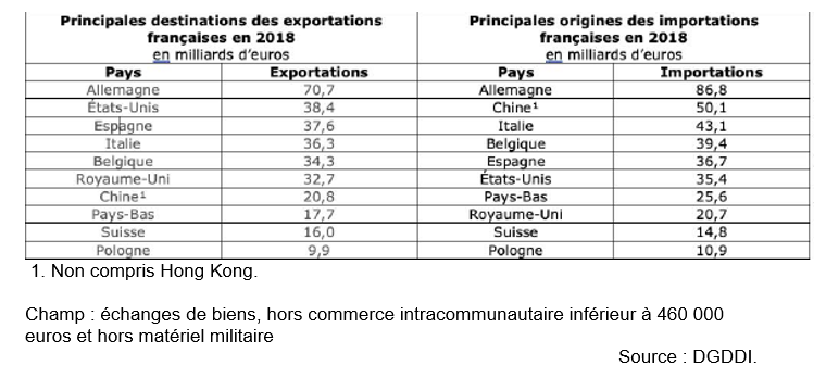 Selon la DGDDI, l’Allemagne est la principale destination des exportations françaises, loin devant les États-Unis avec 70,7 milliards d’euros d’exportation en 2018. Le voisin d’outre-Rhin est aussi le premier pays d’où proviennent nos importations, avant la Chine, avec des importations venant d’Allemagne s’élevant à 86,8 milliards en 2018. Bref, l’Allemagne est le premier partenaire commercial de la France. (document 1)