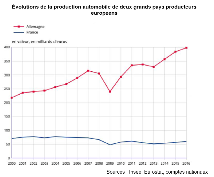 Selon les données de l’Insee et d’Eurostat, la production automobile de l’Allemagne s’élevaient à 400 milliards d’euros en 2016 contre près de 220 milliards d’euros en 2000. Pour la France, la production automobile était de 60 milliards d’euros en 2016 contre près de 70 milliards d’euros en 2000. Au début du siècle, la production automobile allemande était 3 fois supérieure à la production automobile française ; en 2016, la production allemande est près de 7 fois supérieure à la production française ! (document 2)