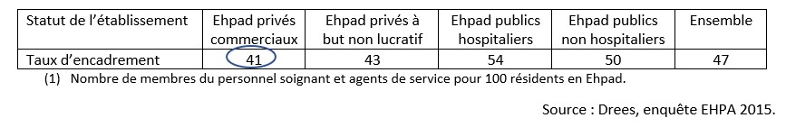 En 2015, en France, selon la Dress, dans le Ehpad privés commerciaux, il y avait 41 soignants et agents de service pour 100 résidants.