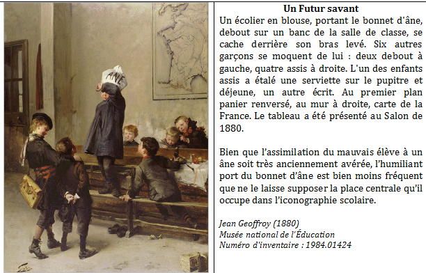 Il s’agit donc d’une punition… par l’humiliation. Si la punition n’a pas disparue, « les punitions infligées doivent respecter la personne de l'élève et sa dignité : sont proscrites en conséquence toutes les formes de violence physique ou verbale, toute attitude humiliante, vexatoire ou dégradante à l'égard des élèves » (Bulletin officiel du ministère de l'Éducation nationale du 13 juillet 2000).
